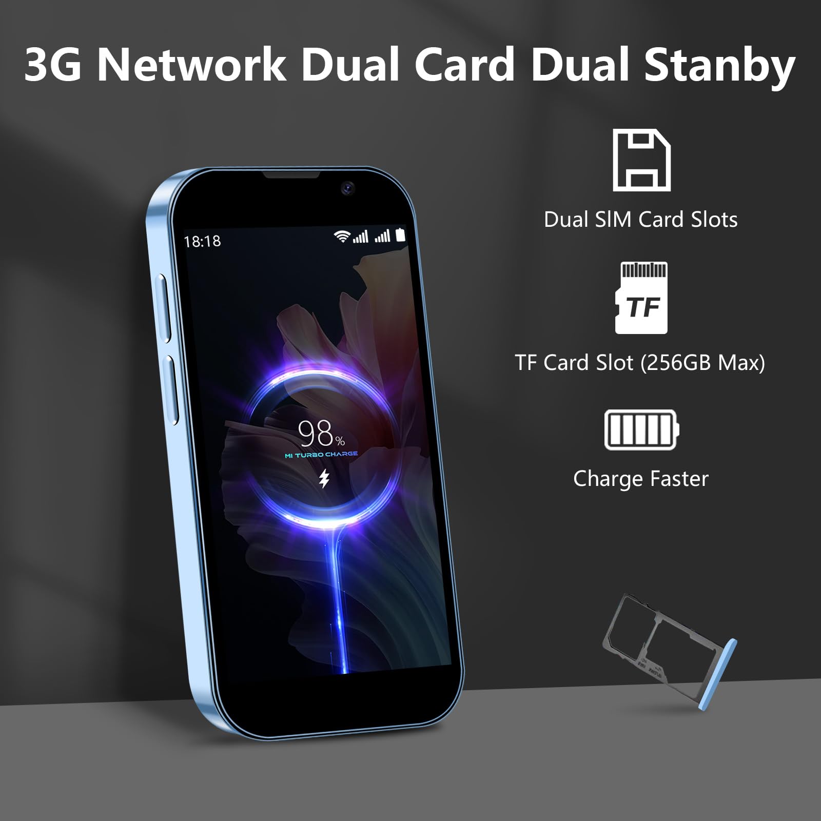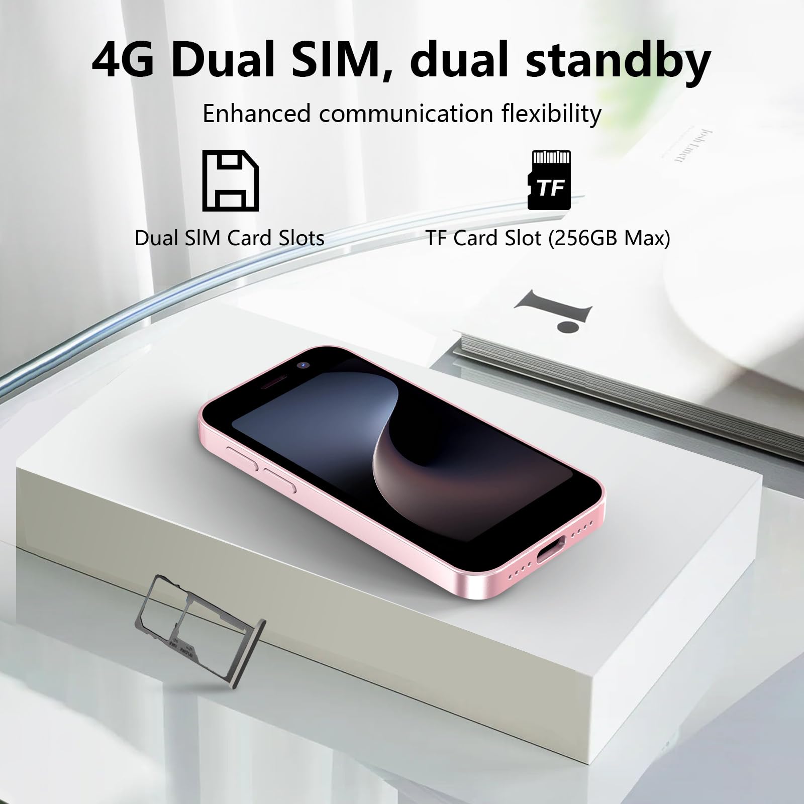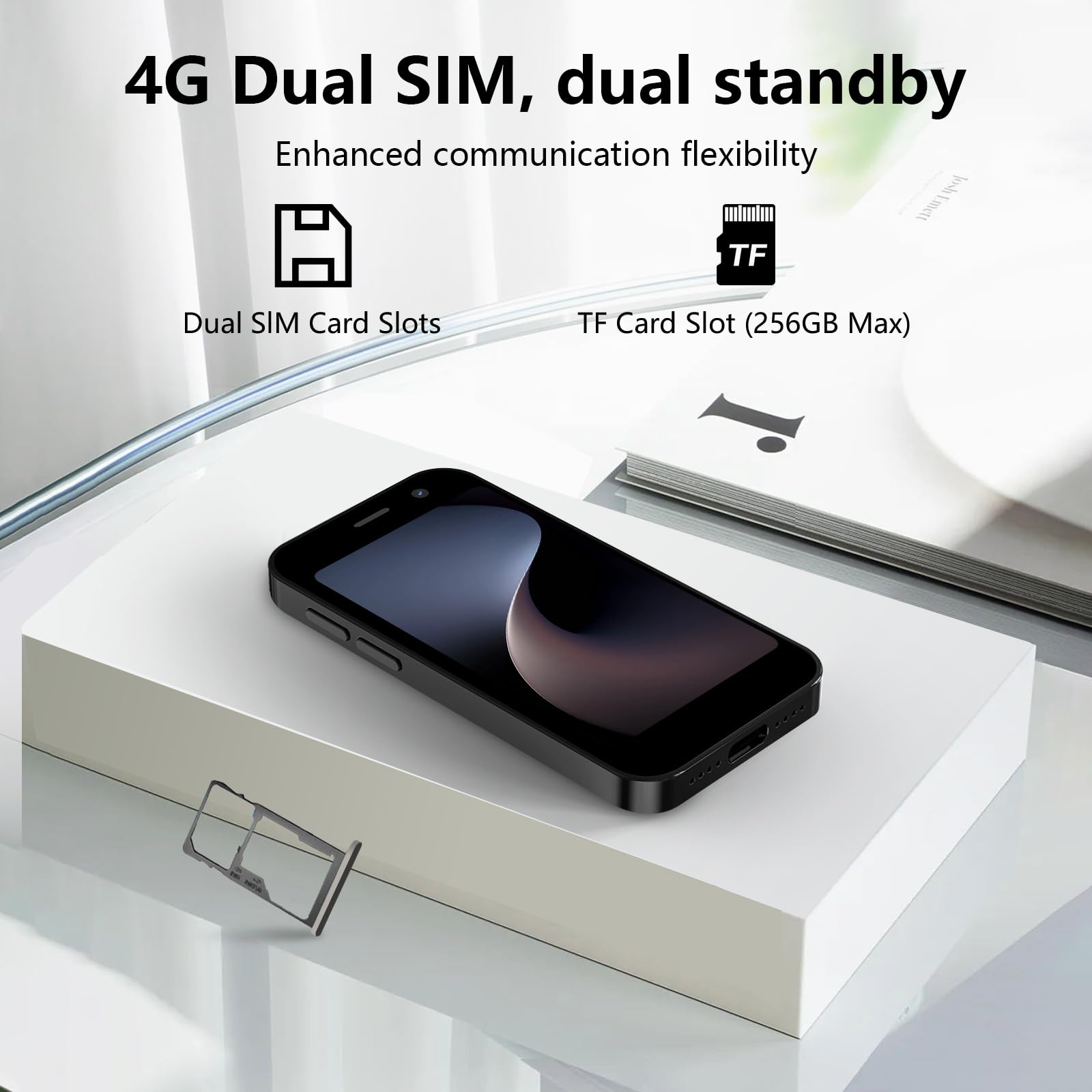 - 4. Small body big memory: This mini phone supports dual SIM, allowing you to easily insert two SIM cards from different carriers, eliminating the hassle of carrying two phones. It also supports inserting a memory card, significantly expanding storage possibilities. Whether you need to store a large number of photos, videos, music, or big files, this phone handles it effortlessly, freeing you from worries about insufficient storage space