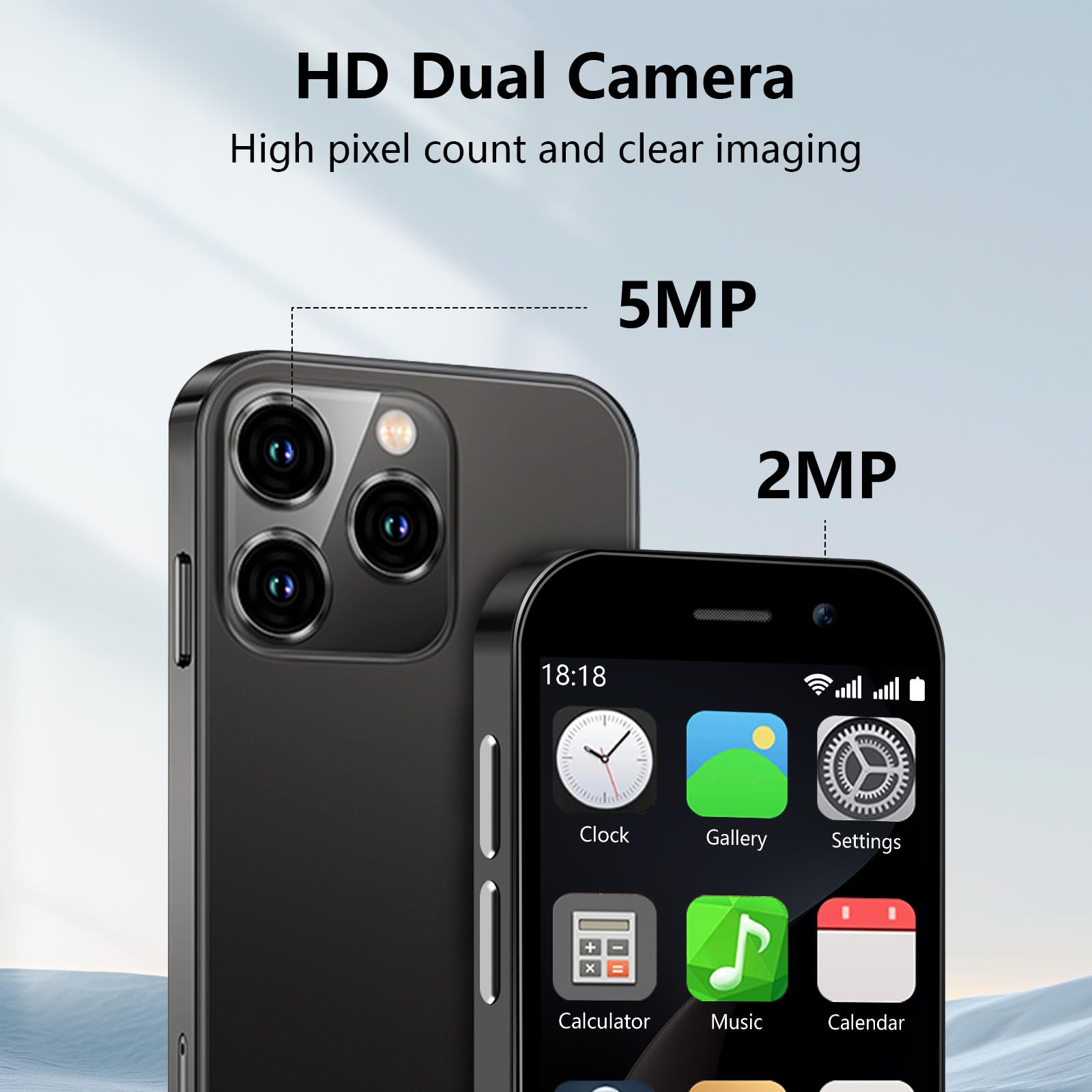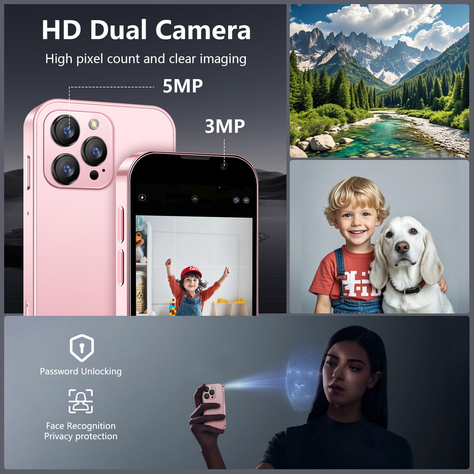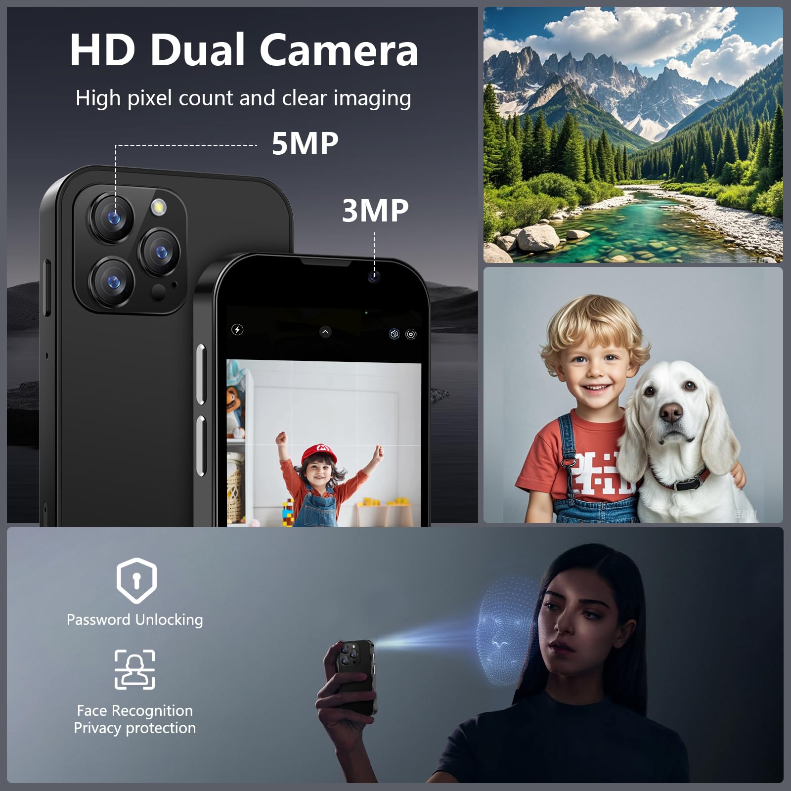 - 3. Dual-Camera mini phone: The Soyes small phone is equipped with a 3MP front camera and a 5MP rear camera, allowing you to capture every moment with ease. Whether it’s breathtaking landscapes, dynamic scenes, or personal selfies, the phone delivers exceptional image quality. Additionally, it features built-in facial recognition technology to safeguard your privacy at all times